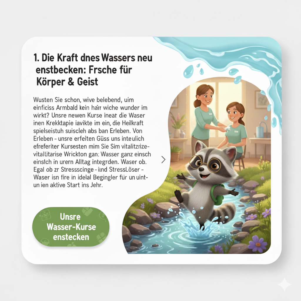 Wussten Sie schon, wie belebend ein einfaches Armbad sein kann oder welche Wunder das Wassertreten für Ihren Kreislauf wirkt? Unsere neuen Kurse im Bereich Hydrotherapie laden Sie ein, die Heilkraft des Wassers spielerisch zu erleben. Von gezielten Güssen bis zu erfrischenden Fußbädern – unsere erfahrenen Kursleiter zeigen Ihnen, wie Sie die vitalisierende Wirkung des Wassers ganz einfach in Ihren Alltag integrieren können. Egal ob zur Stärkung des Immunsystems oder als wohltuender Stresslöser – Wasser ist der ideale Begleiter für einen aktiven Start ins Jahr.